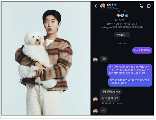 임영웅 논란, "제가 정치인인가요? 목소리를 왜 내요?" 사회생활을 해보니 침묵이 정말 금이더라.요새 시국이 흉흉한데 임영웅 씨가 한 말이 세간에 이슈가 되고 있다.지금 대통령 탄핵안으로 나라가 시끄러운데 목소리를 안 내고 있다고 누군가가 DM을 보내 모양이다.나는 잘잘못을 따지고 싶지는 않다. 단지 그의 대응법이 좀 미숙했다고 해야 할지 아니면 젊은 객기에 경솔하지 않았나 하는 생각도 든다. 자 지금부터 다른 얘기. 정치 이야기 아니다. 실제 생활에 있어 저런 무례한 문자가 오거나 면전에서 저런 말을 들으면 무시하는 게 상책이다." 아, 네...." 하고 지나치면 된다.아니면 침묵하고 3~4초간 상대방을 쳐다보면 된다.아니면 그 말의 정의를 묻는다." 뭐 하냐니, 그게 무슨 말이죠?" 그러면 상대는 주저리 주저리 떠들 것이다. 가만히 상대를 주목하면서 다 .. 카테고리 없음 2024.12.08